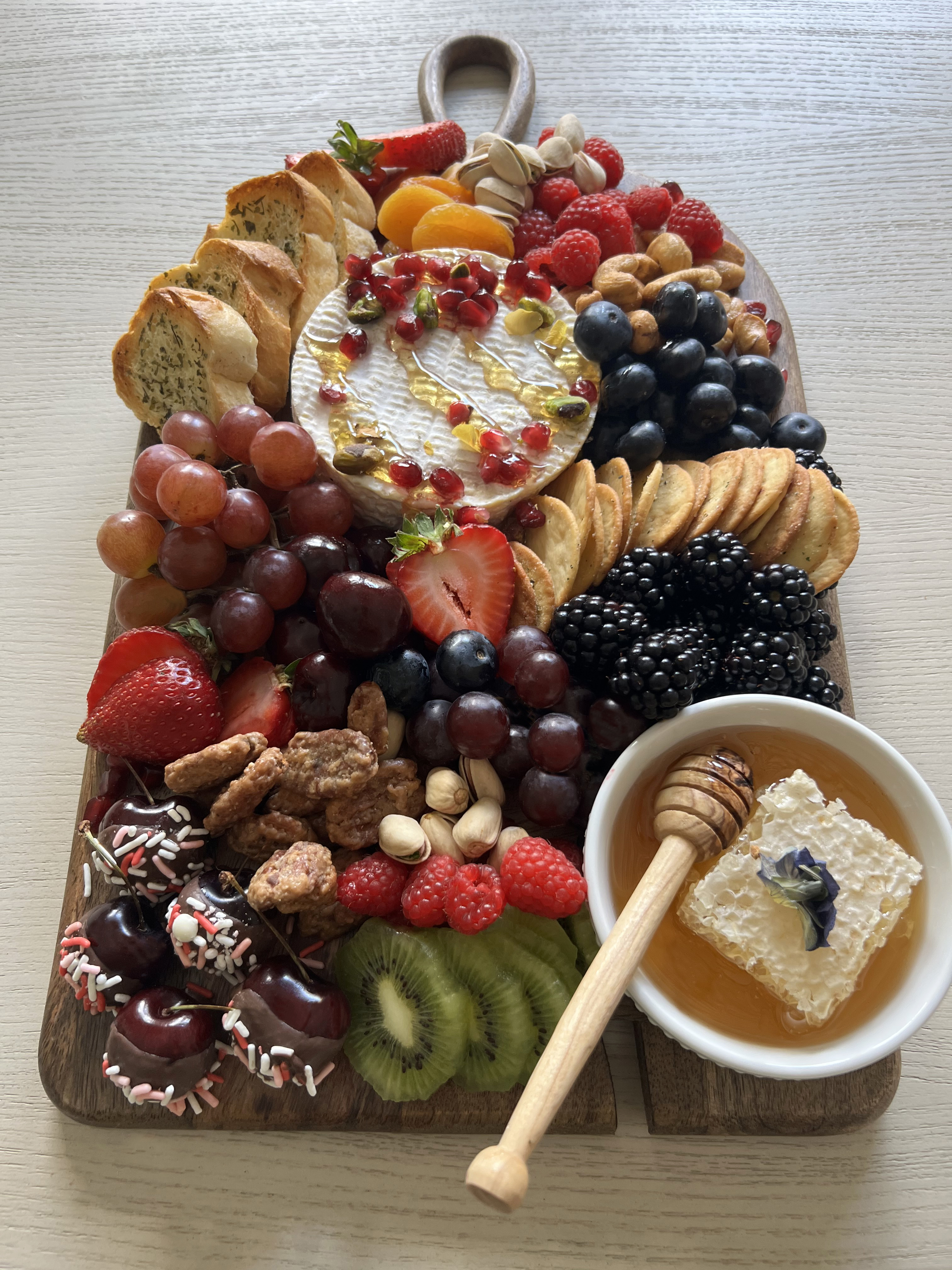 Our tasty brie and fruit board is perfect for any small gathering or as an addition to another large board. Featuring a large wheel of creamy brie accompanied by lots of fresh seasonal fruit, candied pecans, pistachios, crackers, dried fruit and toasted baguette. Finished with two types of chocolate covered fruit adorned with sprinkles and local honey, honey drizzler and honeycomb. Comes with an additional small box of crackers and baguette.