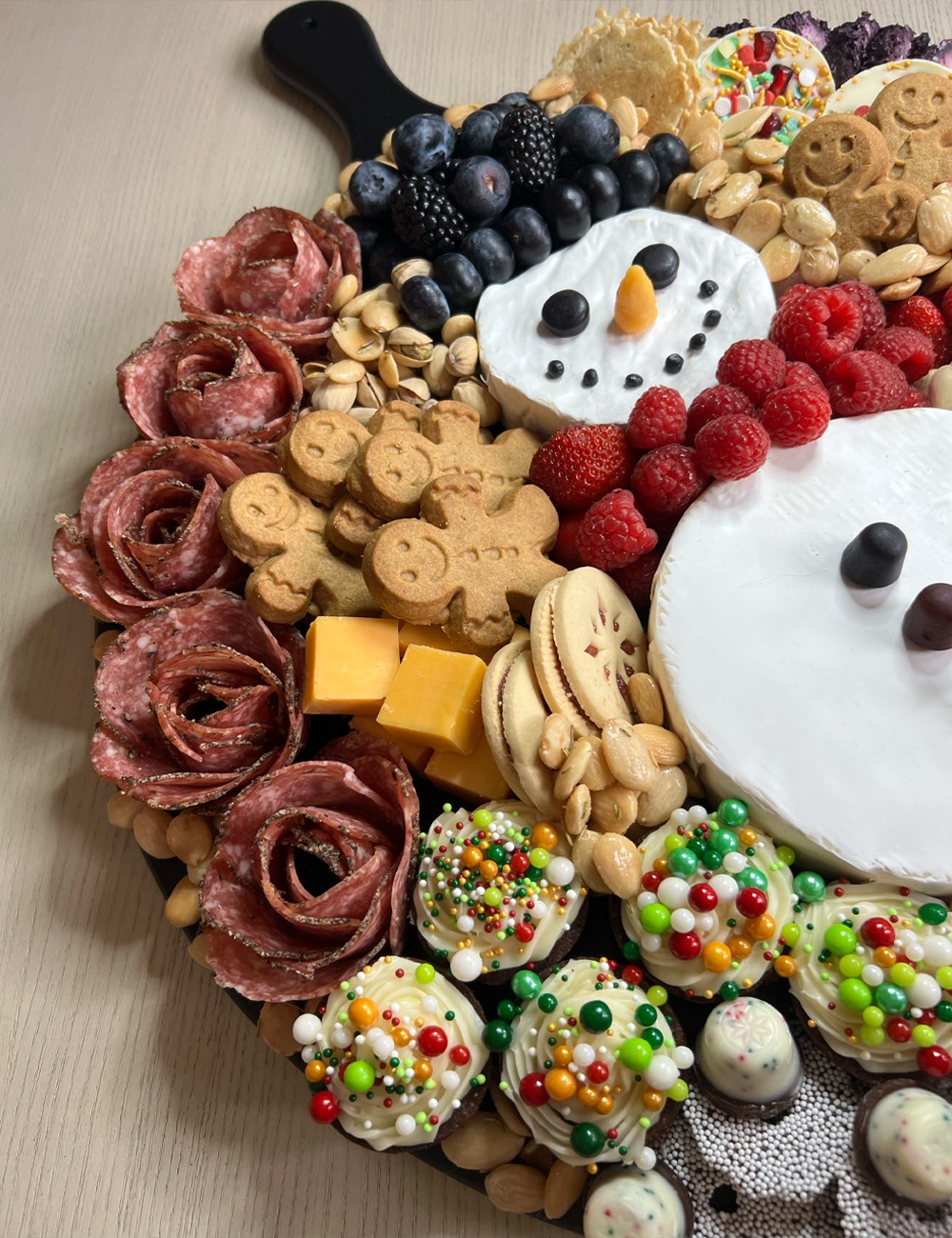 Baby it’s cold outside, so come back inside and warm up with our BrrrrrrieeeMan Board, styled to look like a little snowman, complete with blackberry and blueberry top hat and a cherry, raspberry and strawberry scarf. Includes two rounds of brie, blueberry goat cheese, manchego, and extra sharp cheddar accompanied by various berries, salami roses, pistachios, marcona almonds, brownies frosted with cream cheese and edible holiday sprinkles, gingerbread men, white chocolate bark, cookies, and various chocolates. Comes with a pack of savory crackers or water crackers.