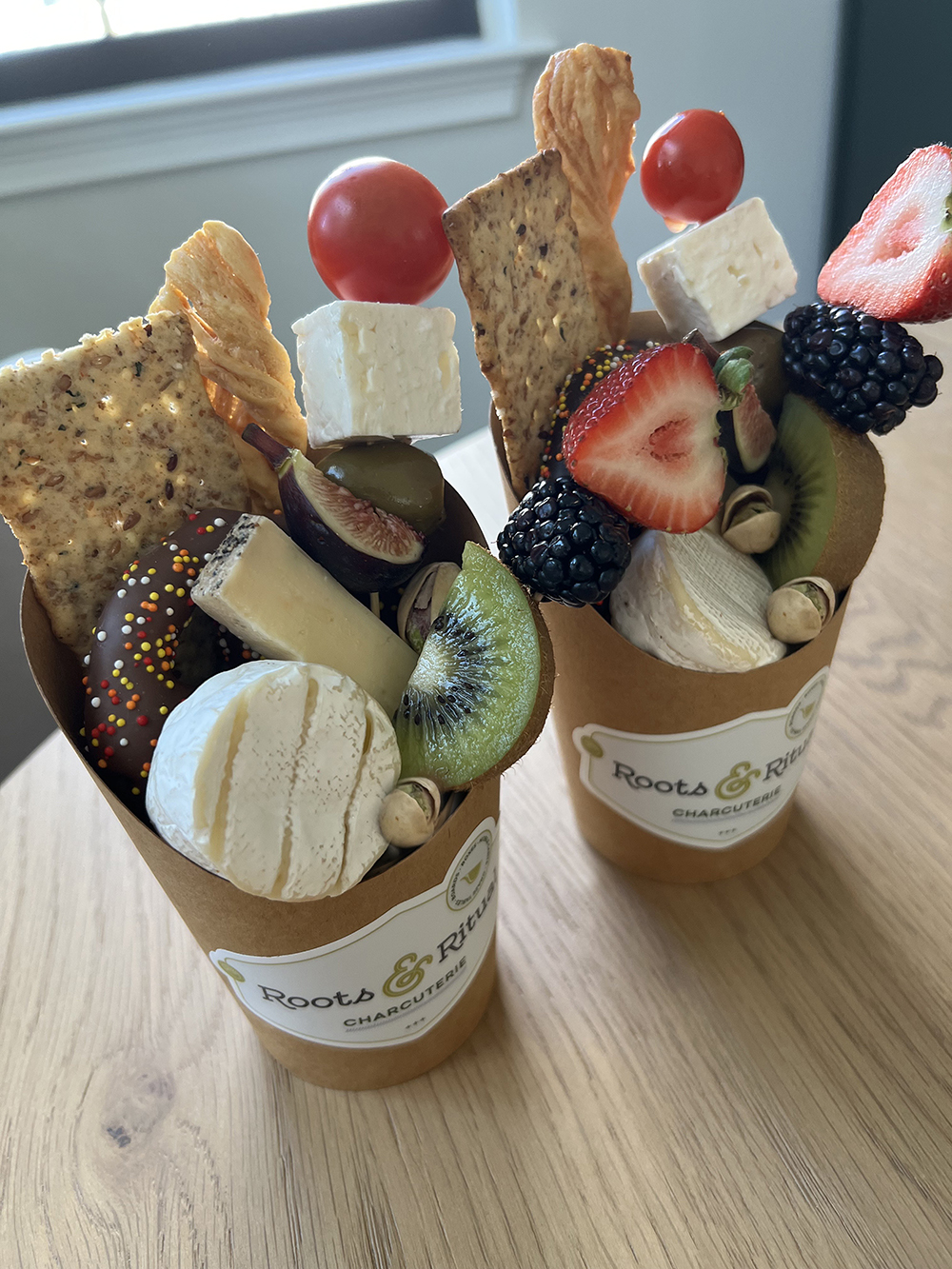 Roots & Ritual charcuterie cups are great for events and weddings and can be customized with your own ingredient selection. Cups contain fresh local ingredients: cured meats, flavorful cheeses, fresh produce, dried fruit, pretzels, nuts, crackers, sweet dessert treats and fresh herbs and a honey stick for garnish. Vegan options available. Branding  can be added for an additional fee. Please allow for additional time if you want to add custom branding. We will provide a quote for branding separately. Scheduled delivery is also available.Â