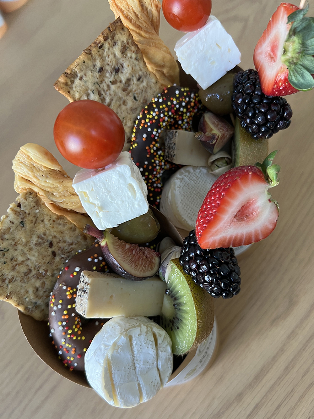 Disclaimer: All pictures are examples only and are subject to change based on seasonality. Our boards come ready to dig in. We recommend enjoying your order as soon as possible. Items are perishable. If you are unable to nosh immediately, please store your board in the fridge while covered to preserve freshness. Boards should not be left out at room temperature for more than 4 hours. After this 4 hour unrefrigerated period, please discard. Certain items could pose a choking hazard. We do not advise storing an uneaten charcuterie board for more than 24 hours in order to preserve freshness.