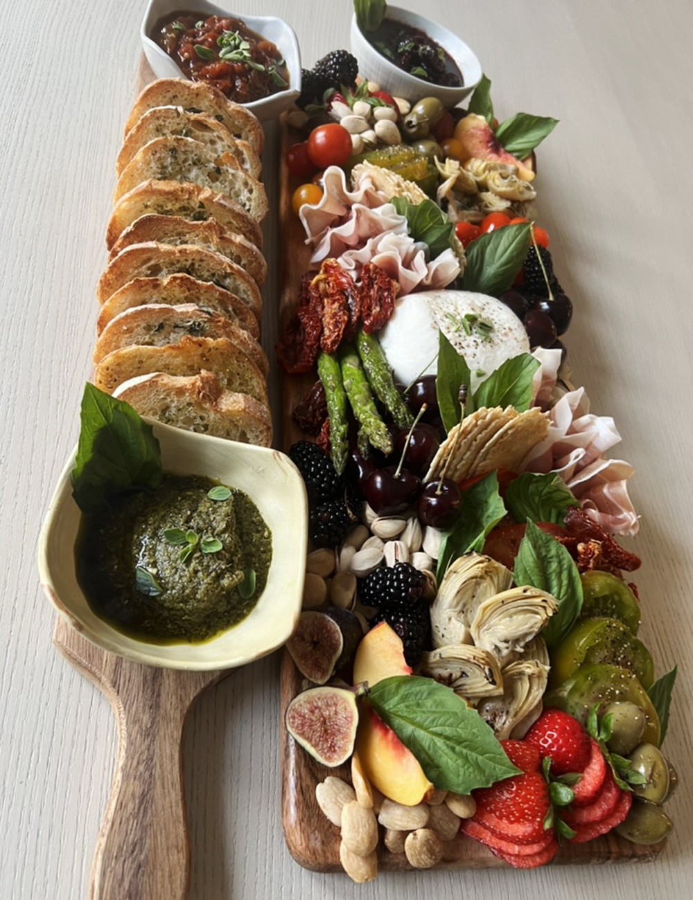 This board includes a delicious variety of fruits, veggies and meat that pair well with creamy burrata – prosciutto, peaches, basil, cherries, artichokes, figs, grilled asparagus, heirlooms, strawberries, sun-dried and cherry tomatoes, crackers, pistachios, rosemary marcona almonds, olives, blackberries, and peppadews. Two scratch made dips included: balsamic cherry compote and a spiced tomato compote. Also includes a fresh sliced baguette served with pesto.