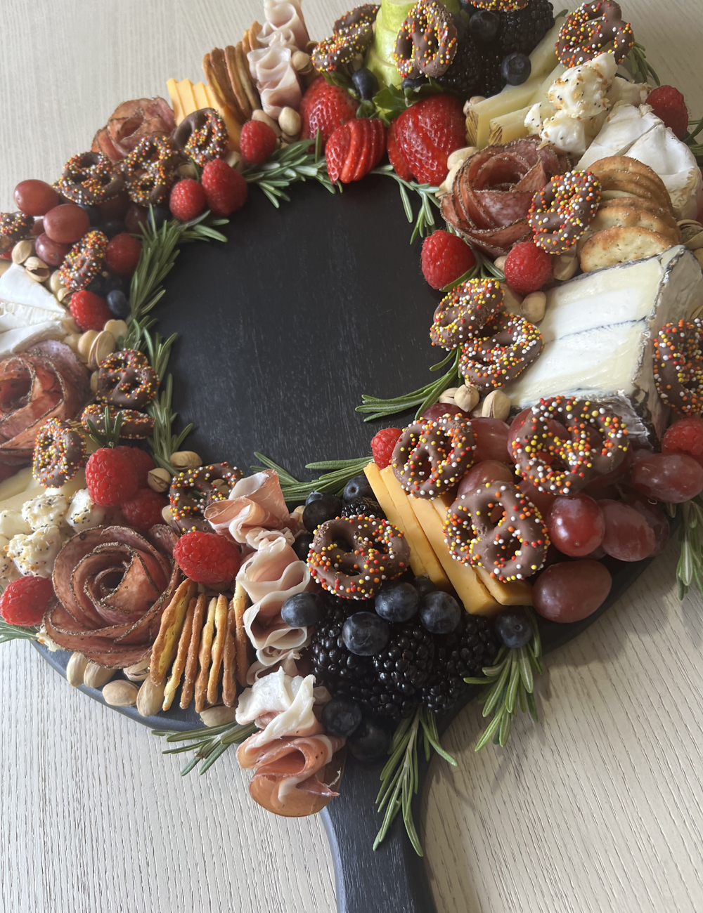 Our holiday wreath is packed with flavor including 6 cheeses – brie, everything seasoned mozzarella balls, sharp cheddar, humboldt fog, manchego and havarti. Salami roses and prosciutto pair with various fresh fruit, nuts and crackers. Festive milk chocolate covered pretzels provide a sweet treat. Garnished with rosemary. Comes with an additional small box of crackers.