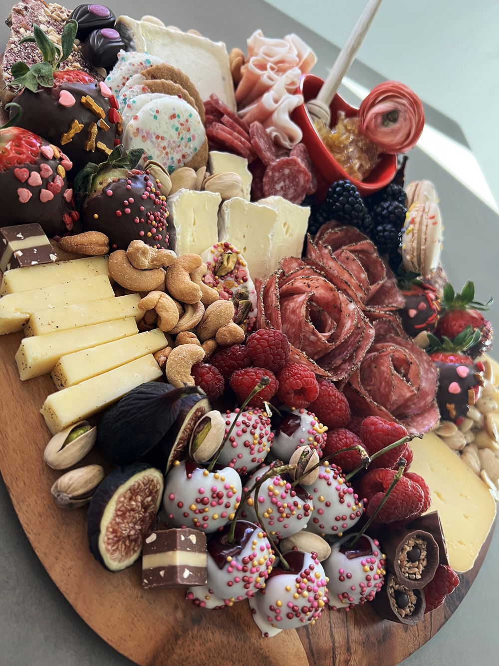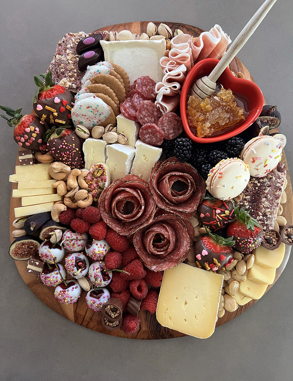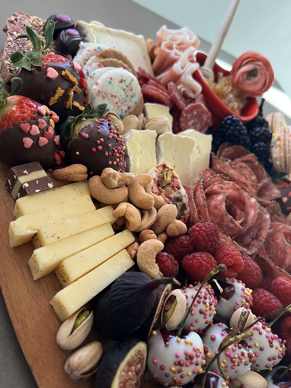 Have a romantic picnic and skip the reservations. This board is built for the perfect charcuterie date. Peppered salami, summer sausage, prosciutto, paired with beehive cheese dusted with earl grey, brie, smoked gouda, gruyere and Humboldt fog. Piled high with fresh berries, chocolate covered strawberries and cherries, local nutty marionberry toffee, cordials, figs, cashews, pistachios, marcona almonds, birthday macarons, white chocolate dipped ginger cookies and various dainty chocolates.