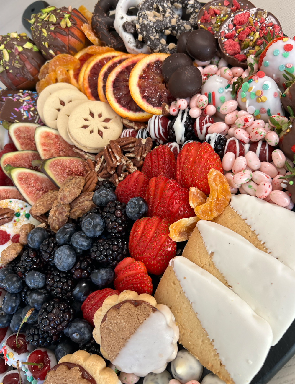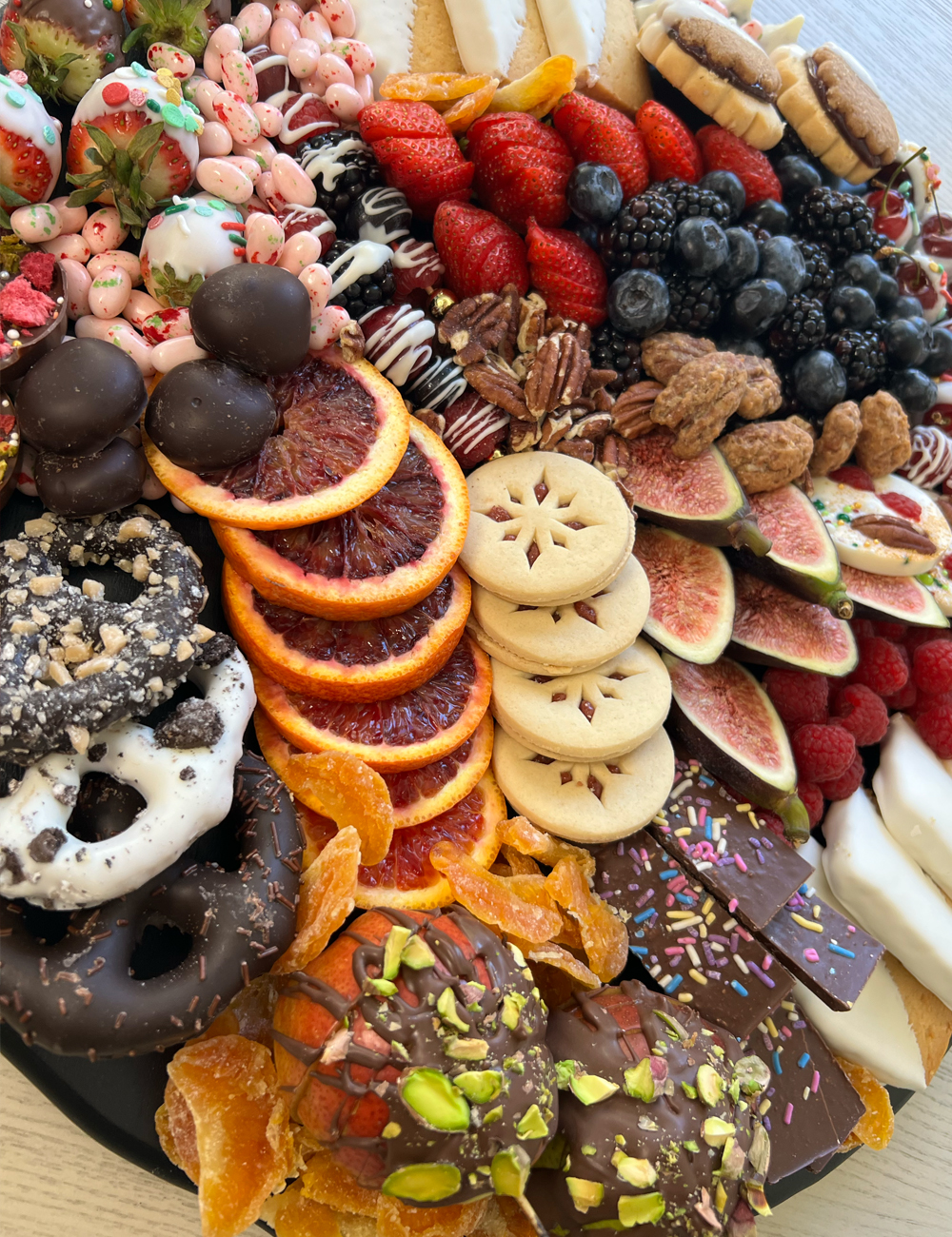 Our Sugar Mama dessert board is packed with fresh fruits like raspberries, figs, blackberries, blueberries, strawberries, cherries and blood oranges, as well as white chocolate dipped strawberries, raspberries and pretzels.Features chocolate pistachio drizzled pears and raspberry ginger glazed, coconut and linzer cookies, white and milk chocolate bark coins with dried fruit, nuts and edible sprinkles, pecans, candied pecans, chocolate covered figs and holiday jellybeans. Comes with a packet of honey sticks for drizzling.